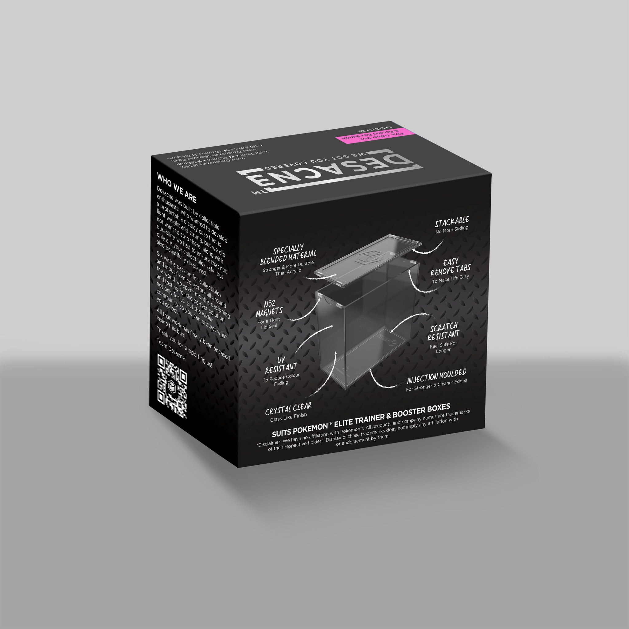 Protect your precious Elite Trainer & booster boxes with the sturdy, beautiful Desacne Box Protector! Designed specifically to hold and display Pokémon Elite Trainer and Booster boxes, each shell secures your cherished collections from scratches, UV and accidents while maintaining your booster’s visual charm. The lid seals smoothly using magnets, and can stack on top of other Box Protectors too. Perfect for storage, display and retaining your collection’s value.